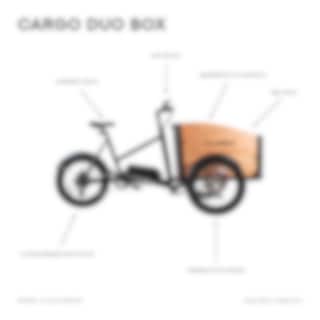 Evobike Duo Cargo Box är en slimmad elektrisk lådcykel som är perfekt för dig som är ute efter en elcykel där du kan lasta mycket. Du får enkelt plats med flera barn, husdjur och packning i elcykelns låda som är försedd med sittbänkar (med plats för två barn) och säkerhetsbälten. Duo Cargo Box har en svartlackerad ram samt detaljer i borstat aluminium och läder vilket ger lådcykeln en mer designad look.