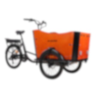 Evobike Cargo Pro har et robust og gennemtænkt design med tydeligt fokus på funktion og komfort. Den rummelige ladkasse foran har plads til fire børn og er udstyret med 3-punktssele for tryg kørsel. For dig der ønsker at beskytte passagerer eller last mod regn og vind, er det muligt at tilkøbe et kalechetag, som nemt monteres på kassen og giver ekstra komfort året rundt. Rammen er fremstillet i slidstærkt stål, der tåler hård brug og høj lasteevne. LED-belysning foran og bagpå sikrer, at du er synlig i trafikken, også i mørke. Modellen har forskellige hjulstørrelser, 20 tommer foran og 24 tommer bagpå, for bedre balance og kørefølelse.